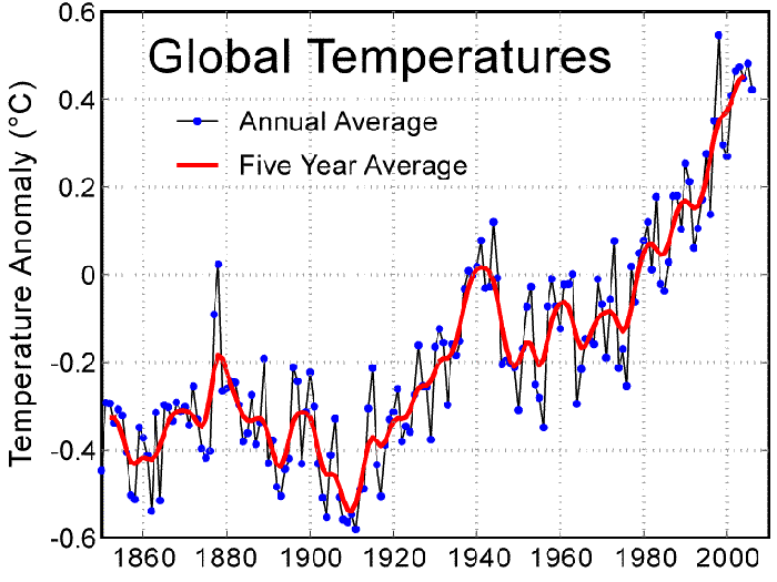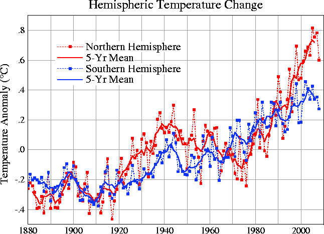 These next two graphs, provided by NASA, display the change in Global Temperatures over the last 150 years along with a breakdown of temperature anomalies for both the Northern and Southern Hemispheres. As you can see from this data, the Northern Hemisphere is currently experiencing a greater increase in temperature than the Southern Hemisphere.