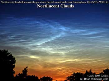 “Noctilucent clouds can form only under very restrictive conditions; their occurrence can be used as a sensitive guide to changes in the upper atmosphere. Since their relatively recent classification, the occurrence of noctilucent clouds appears to be increasing in frequency, brightness and extent. It is theorized that this increase is connected to climate change.” Quote from: http://spaceweather.com/