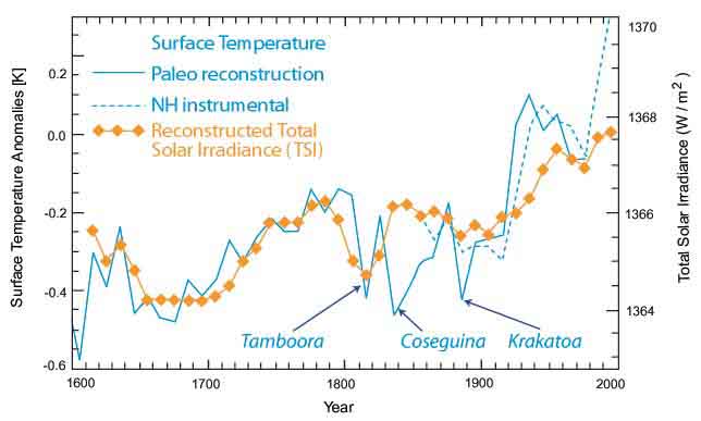 The following graph compares Solar Irradiance in relationship to changes in Earth's Surface Temperature. From this graph, you can further see that there are three major dips in surface temperature between 1800 and about 1920 that do not track with the solar irradiance. Note that these three cooling periods are the direct influence from volcanic eruptions during the same periods. We will discuss the cooling affects from volcanic eruptions in detail later in this material.