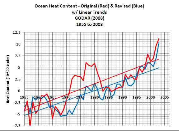 The next graph, also from NASA, displays the changes in global ocean temperatures or Heat Content. Notice that the data ends in 2003 as the Heat Content is still increasing exponentially and since 2003, Arctic ice melt appears to be continuing at an exponential rate.
